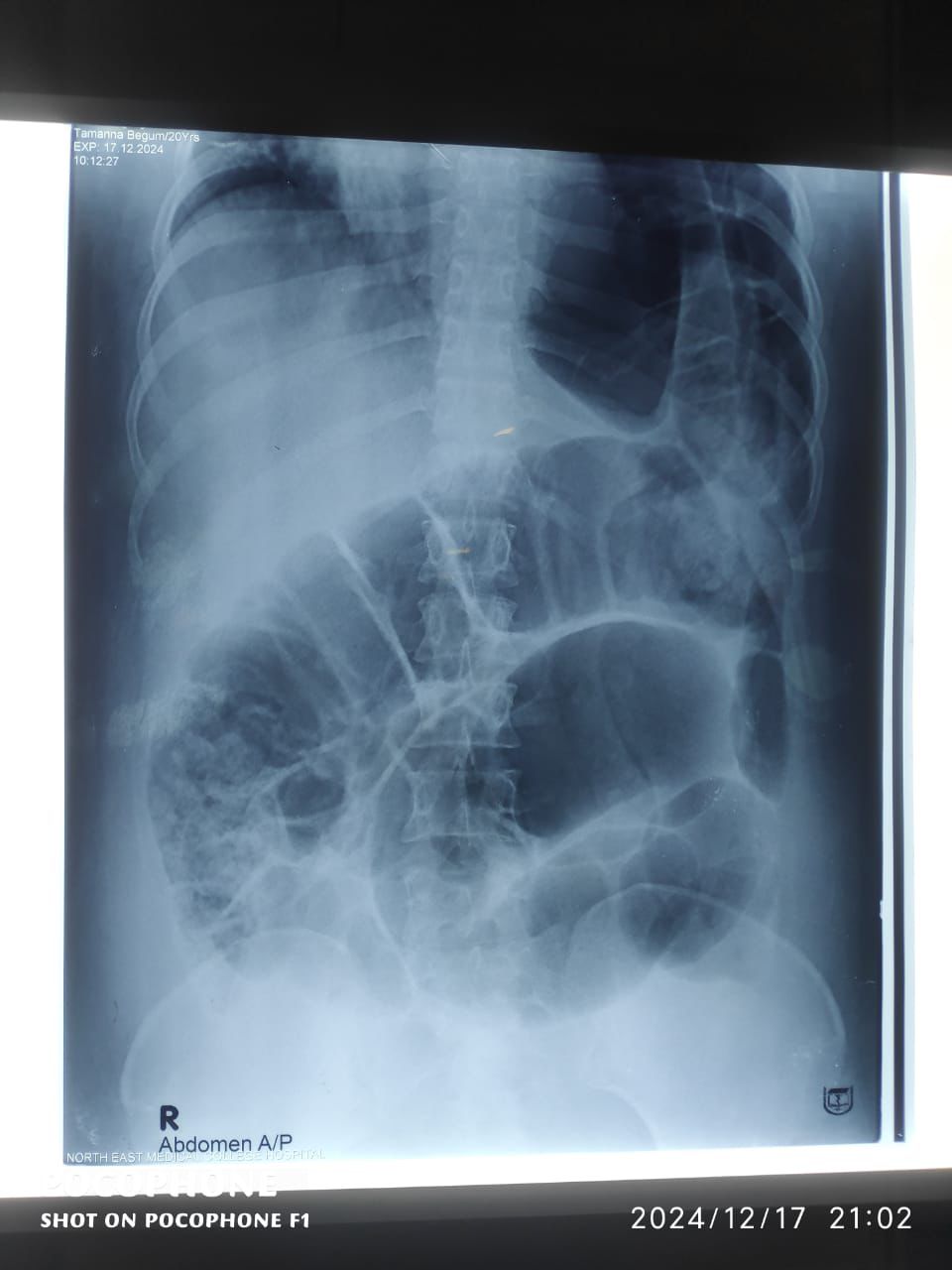 After 48 hours, on her second post operative day her abdomen gradually became distended, bowel sound became absent and suddenly she developped severe respiratory distress. The attending doctor tried with propped up position, oxygen inhalation and intravenous frusemide as it was taken as heart failure but patient was not improving rather became critical within an hour. She became tacypnic, respiratory rate 30 bpm and saturation dropped to 60%.